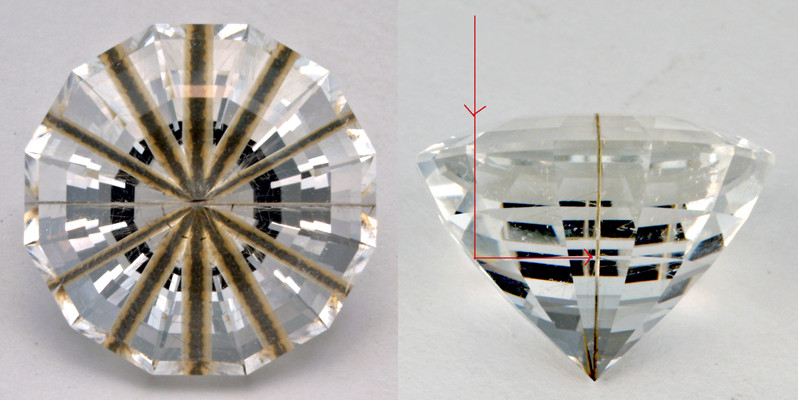 The left half of the image shows the face-up presentation of a SINGLE needle inclusion, centered in the gem. The right half of the image shows a profile view, illustrating how the pavilion mirror facets give us a side-view of the needle from various positions around it.