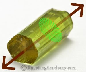 Tourmaline is a trigonal system crystal, so it’s uniaxial (one optic axis). In uniaxial crystals the optic axis is called the “C” axis – which, in Tourmaline runs along the longitudinal direction of the usually-pencil-shaped crystals. The C axis in this graphic is indicated by the brown arrow. The other axes are referred to in the singular as the “A/B axis”. This is because light behaves the same along any path through them. Any direction perpendicular to the C axis, as shown by the green disc cutting across the crystal, is on the A/B axis. Due to this feature, Tourmaline can deliver different colors based on the path light travels (relative to the crystal structure) through your finished gem.