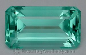 A Tourmaline with a desirable C axis color, especially one that matches the A/B nicely, is suitable for cutting in standard Emerald design – or any other design that pumps light through the C axis. Here’s an example. Note the large triangles created by pavilion facets on each end, displaying C axis color.