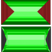 The volume calculation for the standard step design in a 2:1 L/W is .736, and for the second design is .785 – for a difference of .049. By changing from the standard step cut to the chopped-end cut, we not only enhance our color presentation, we also preserve 6.6% additional weight in the finished gem – and by doing less labor…