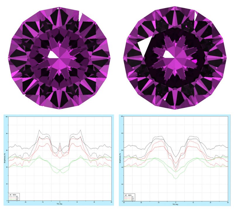 The left half of the image above shows a Long&Steele SRB rendered at RI=1.76 (corundum). The right half of the image is a rendering of the same design, the only difference being crown angles lowered by just TWO degrees. The black-eye rendering on the right is about as dramatic as the light-return graph below it.